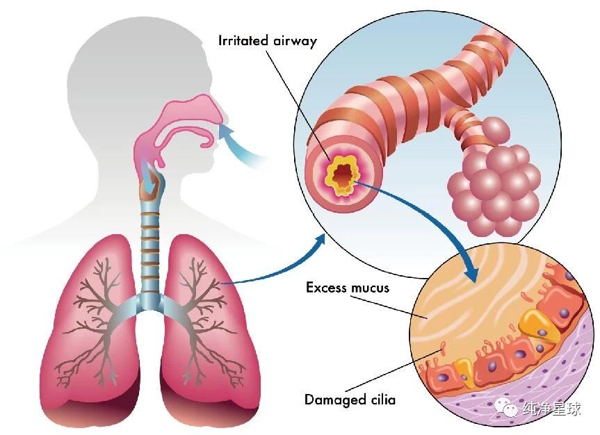 黏液纤毛清除系统虽功能强大但其本身也很脆弱!多种体内、体外不利因素均可快速且显著破坏黏液毯的完整性,出现纤毛摆动障碍、黏液传输速率下降,上皮细胞直接暴露在黏液毯的缺损区域,致病颗粒物直接侵袭上皮细胞并持续停留,感染或哮喘等易于发生。