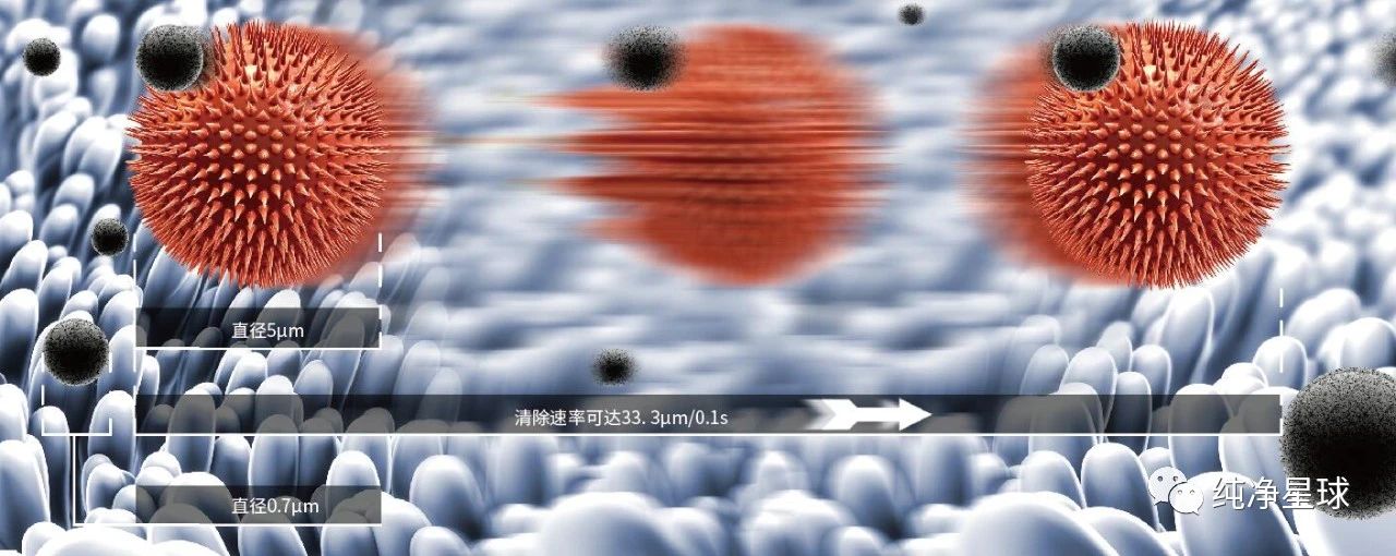 当黏液纤毛清除系统功能健全时,花粉、细菌或其他颗粒物在0.1s内即可被移动33.3μm;以直径3μm左右的球菌为例,当其从吸入气流中坠落在黏液毯的一刻起,瞬间(0.1s)即被“排污的溪流”冲刷到十倍自身尺寸之外,细菌感染无从发生!图中展示直径5μm的可引发哮喘的花粉颗粒及直径0.7μm的细小颗粒物被吸入呼吸道,瞬间(0.1s)即与黏膜的初始坠落点脱离,基本上没有与黏膜细胞充分接触的时间;健全的黏液纤毛清除系统构成了人体最为珍贵的保卫呼吸安全的“动态屏障”(为清晰显示颗粒物运动轨迹,图中隐藏了透明态的黏液毯)。