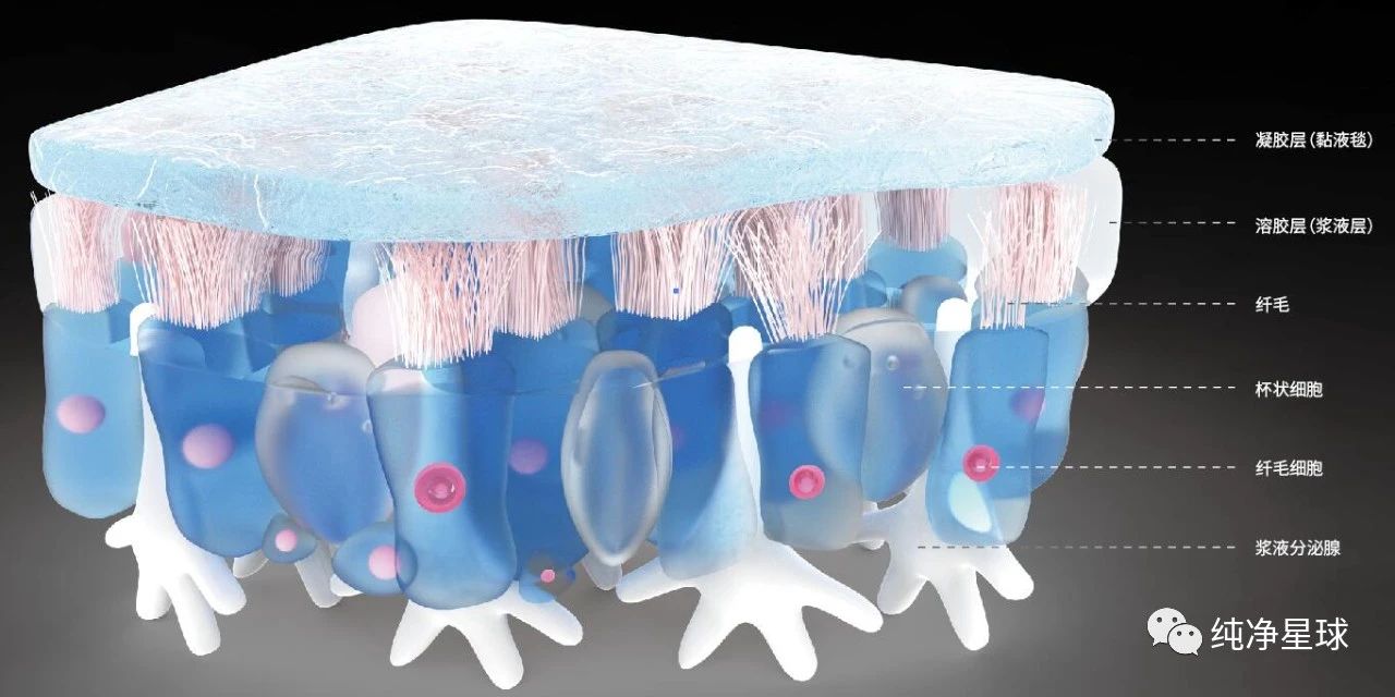 “人体呼吸系统总表面积约140㎡(主要为肺泡面积),传导性气道表面积只有0.03㎡,而这小小的“关键防护区域”则承担了呼吸系统绝大多数的防护任务;凝胶层(黏液毯)、溶胶层及沉浸在溶胶层中的可定向摆动的纤毛是传导性气道呼吸防护的独特结构,外来吸入的花粉、微生物及其他颗粒物被粘附在黏液毯表面,每个纤毛细胞约有200根纤毛,其顶端可接触到黏液毯并以极高的频率做“甩鞭”式运动,使黏液毯类似“溪流”般持续移动,无数条排污的“溪流”将各类颗粒物源源不断的运输至咽部,最终以咳痰或吞咽的方式排出呼吸系统。”