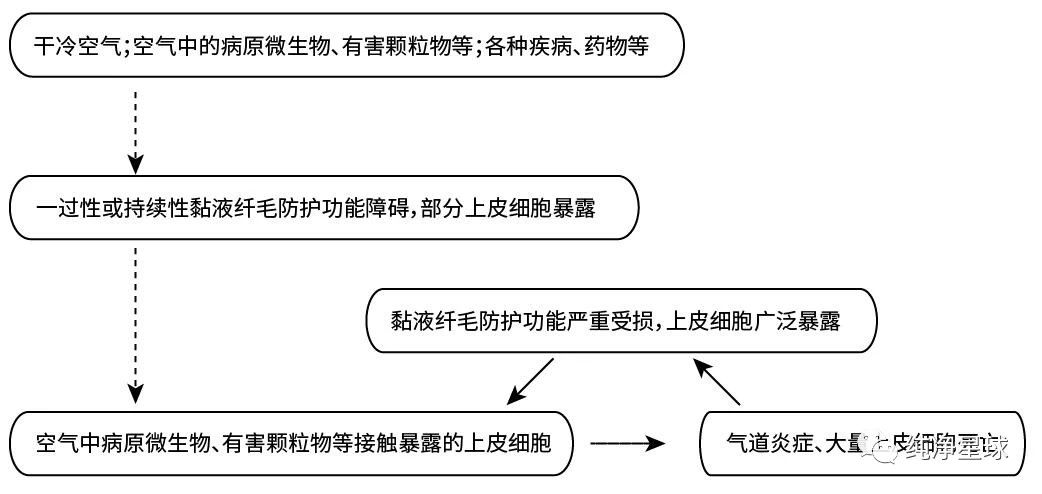 在哮喘病程中,气道炎症(伴随黏液纤毛清除系统的损伤)、气道高反应性两者相互作用形成恶性循环,成为哮喘反复发作及气道炎症迁延不愈的重要原因;气道高反应性的患者,即使遇到日常生活中对正常人影响很小的轻微刺激,如普通感冒、吸入少量过敏原、吸入干冷空气、吸入少量烟雾等就易导致哮喘发作。