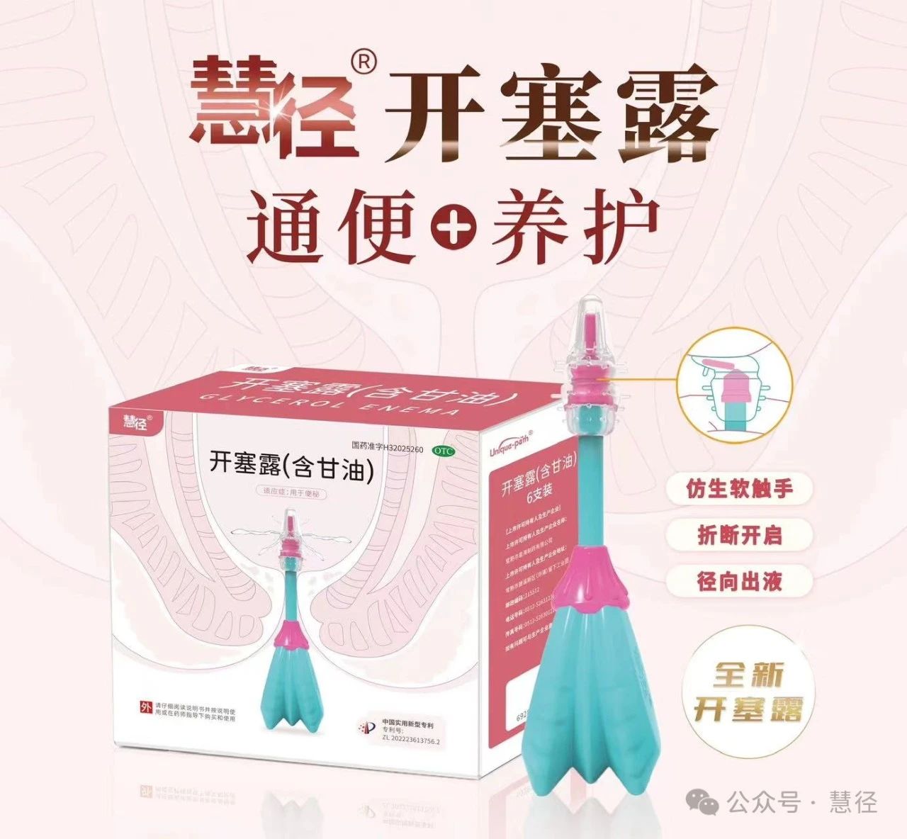 慧径®开塞露 具备安全通便、便意诱导、肛肠养护三大核心功能,三效合一实现了便秘的治疗到肛肠疾病的预防的全过程,填补了开塞露市场肛肠科学养护及肛肠疾病防治的市场空白。